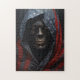 Bilden visar en närliggande porträtt av en person som liknar en ghoul eller zombie med en mörk, nästan skelett ansikte, täckt av ett nätverk av tunt, gyllene linjer. Deras ögon är vidsträckt och intensiv och stirrar direkt på tittaren. Figur är höljt i en hovtäcke av en åldras och tatuerar den amerikanska flagga med det röda och vita rand synligt runt deras nacke och axlar. Bilden är en postapokalyptisk eller dystopisk känsla.