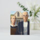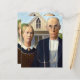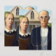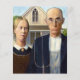 Det här är den klassiska Grant Wood-målningen, American Gothic, som visar en bonde och hans fru framför sitt bondehus, han med sitt klaffgaffel, hennes tittar sidovägar mot honom.