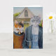 "American Gothic Parody Kattunge" Watercolor Art Greeting Card av konstnären Jean Weiner "American Gothic Parody Kattunge" är en parodi på berömden Grant Wood-tavlan, "American Gothic". Denna parodi har katt i ställe i berömden lantbrukare och dotter i Midwest. Katten av honkön, calico, är klädd i en kolonialtryckt apron och svart klänning. Mannen, grått tabby katt, är klädd i overaller och kostym jacka. Den här katten håller i det ikoniska pitchgaffeln! Vem sa att katter inte kan odla? Säkert att brista vilken kattälskardag som helst! Den här produkten var designad med hjälp av vattenfärgsartisten Jean Weiners ursprungliga vattenfärgsmålning, "American Gothic Parody Kattunge". Alla höger för återgivning är reserverade.