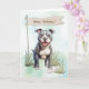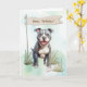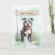 Pit Bull Terrier ligger i det mjuka gräset, ögon fyllt med kärlek och lojalitet. En "Grattis på födelsedagen" banderoll ovanför och ett närliggande ben fullbordar utomhusscenen och skapar detta kort ett underbart val för någon som älskar, modigt och fullt av hjärta.