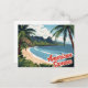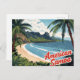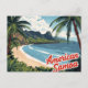Vibrant, stylized travel poster illustration of a secluded, crescent-shaped tropical beach framed by palm trees, with lush green mountains sloping down to the clear blue ocean, labeled "American Samoa." Captures the serene beauty of the South Pacific national park. Perfect for beach lovers, tropical travelers, and collectors of island destination art.