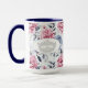 En hobnagelliknande traditionell amerikansk skönhetstävling krona lägger sidorna av detta kaffe mugg på en rosa och blått blommigt, NO-text. Svarta handtag och mörk blått insida, men du kan ändra det. Köp som det ser ut eller anpassa mugg. Lagrar Image freepik.com
