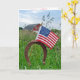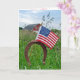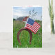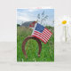 flagga och hästsko på taggtrådsstängsel med röd ladugård i bakgrunden för patriotisk högtid