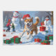 En helgdag med hjärtslitande hund i snö, som bär en julhatt och omges av färgfulla presentlådor. I bakgrunden bygger barn snögubbe bredvid ett Julgran som är täckt av snö och skapar en glatt vinter under. Perfekt för att sprida helgdag och fånga julens magi.