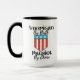 Fira ert amerikanska arv med det här patriotiska tvåtonade mugg som säger "Amerika efter födseln, patriot efter eget val" i ett svart dekorativt skript med en roligt i mitten av 70:s tvåhundraåriga flagga av stars och stripes.