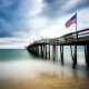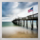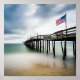 Amerikanska Flagga på en serenpir sträcker sig in i lugn vatten under ett grumligt himmel.