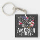 Amerika först: design med ett hårt örn under flygning, klämmande klo redo, mot en katastrofal amerikansk flagga.