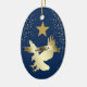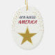 Här är en söt patriotisk julprydnad som är unik! På framsidan finns en glitter guld star och en glansig silhuette guld örn som ska landa. Över örnen vingar är en guld-banderoll som säger AMERICA. Glittery guld-konfeetti dekorerar de lämnat och höger sidorna, och allt placeras på en mörk blått bakgrund. Baksidan av prydnadsämnet är vit, med samma guld konetti gräns, en större guld-stjärna, och anpassningsbarna i ett blått fält och ett rött fält.