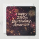 Ljusglada fyrverkerier exploderar över en mörk himmel och firar en stor händelse. Illuminerad text lyder "Grattis på 250-årsdagen, Amerika" och tillför en festlig stämning.