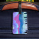 Ett abstrakt med ett unikt färg och struktur som visar en bergsplats med träd och dimma i skuggor av lila, blått, teal och cyan.