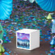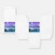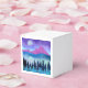 Ett abstrakt med ett unikt färg och struktur som visar en bergsplats med träd och dimma i skuggor av lila, blått, teal och cyan.