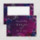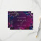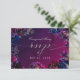 Ett häpnadsväckande svarskort för lila och blåsfärgat bröllop med blå smycke-OSA som sänder tillbaka med e-post med ett tecken på djup lila, burgundy och brödrosa rosa-peonier som adorberats med silver-sprejning och skuggande silver-konturer på en lila och shock rosa vattenfärg tvättar bakgrund med OSA i en swaash-typigrafi i silver med din namn i i med din . ett rustiskt skript och ett litet versalteckensnitt utan serif som ger information om dina detaljer.