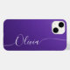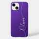 Amethyst Shimmer White Elegant Calligraphy Script Anpassningsbar Namn iPhone 14 Smart Phone Case har en modern och enkel design för trendig och snyggt med din personlig namn i Personlig-handskriven calligraphy-skripttypografi på en metallisk ametystbakgrund. Designad av ©Evco Studio www.zazzle.com/store/evcostudio