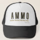 Detta är en truckerkeps som visar ord ’AMMO’ i ett tryckt typsnitt i bra med guld brev svarta konturer som skapar akronymen A.M.M.O som står för (Ambious Movement Motivating other) i detta AMMO Apparel USA-akronymen stil och tema. Dessa hattar är bekväma, avslappnaden kan ställas in från 17 till 24 tum med en 100 % framsida av nylonskum och baksida av nylon underbar för daglig använda eller vid särskilda tillfällen.