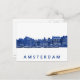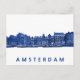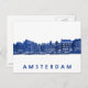 Vykort med traditionella kanalhus och båtar i blå Delftware-stil på vit bakgrund och i blått texten 'Amsterdam'.