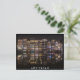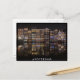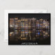 Vykort över traditionella arkitekturhus med färgstark ljus och reflektion i vatten nattetid i Röda ljusdistriktet i Amsterdams stadskärna, Nederländerna med svart kant och vit texten "Amsterdam".
