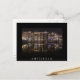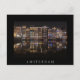 Vykort över traditionella arkitekturhus med färgstark ljus och reflektion i vatten nattetid i Röda ljusdistriktet i Amsterdams stadskärna, Nederländerna med svart gräns och texten "Amsterdam".