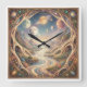 An abstract hidden paradise square wall clock depicted with flowing ribbons of pure light and energy forming organic landscapes, celestial bodies drifting in a tranquil background. Highly creative Art Nouveau interpretation with flowing lines, decorative elements, and a cinematic, ethereal quality. Inspired by the opulent linearity of Alphonse Mucha and the visionary organic forms of Gustav Klimt, rendered with bioluminescent colors and soft atmospheric lighting.