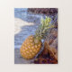 Med en nyplockad tropisk ananas som lutar mot sten i sanden medan vackert hav vågar kraschar runt det.