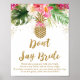 Det här förtjusande "Don't Say Bride"-spelet är ett roligt och interaktivt sätt att kicka igång festligheterna på brudens shower och garanterat en stor hit! Häng upp skylten vid ingången till baby showern tillsammans med en korg med ringar. Varje gäst tar på sig en ring. När någon hör en annan gäst säga "brud" kan de ta den andra personens ring! Den som har flest ringar vid showerns slut vinner! Designen har sommaraktiga, tropiska vattenfärgblommor med falskt guldglitterkonfetti och en falskt guldglitterananas. Koordinerande rosa och guld text kompletterar den vackra blomsterdesignen.