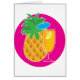 En ananas med ett grönt bästa, är på en cyan bakgrund. I förgrunden finns det en ananascoctail i ett högväxt stemmed exponeringsglas, med en citronkil och ett mycket litet blåttparaply.
