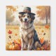 En vattenfärgsmålning stil av ett muntert sitta i hund i en hög av pulserande höst löv, omgiven av små pumpor och spridda hörn. Hund bär lite pilgrimhatt och beams med glädje, och fångade Thanksgivingens anda. I bakgrunden skapar mjuk skörd fält och träd med gyllene hud en fredlig landskapsambians. Struktur och varma, nedsmutsade hösttonar ge är en mysigt, nostalgisk perfekt för att fira säsongens skönhet.
