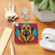 Anatolisk herdehund med tjock gyllenbrun päls, stora uttrycksfulla ögon och ett karakteristiskt format ansikte. Bakgrunden är en livfull blå färg, infattad av en cirkulär dekorativ ram.