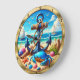 Den här cirkelformade väggklockan har en levande strandscen med ett framträdande blåankare inlindat i rep. En ljusblå krabba och flera olika segelceller, inklusive en stor rosa, en och flera mindre snäckor med flera färgader, är spridda på sandstranden. I bakgrunden prickar vita segelbåtar det blå havet under ett delvis grumligt himmel med fiskmås som flyger. Klockan är innesluten i en gyllene, ribbad ram.