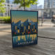 En stiliserad illustration av Anchorage, Alaska skyline vid solnedgång, med berg, vatten och byggnad.