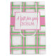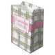 Skapa en presentpåse i personlig som är perfekt för babyduschar som hedrar mammor till att bli av flicka. Den här presentsäcken har ett nautiskt roligt med rosa, vit och grönt i mönster och parollen "Anchors away a Little girl's on her way" på framsidan. På motsatt sida läggs mottagarens namn till.