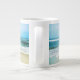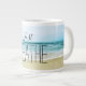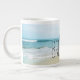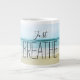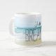 Vacker sandstrand, blåa vågor och luftig himmel med orden "andas bara". Paradis!