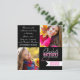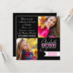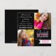 Två svarta fyrkantiga examensfest inbjudningar med en vit examensduk för ditt klassår och text i två färger i skarp kontrast till den svarta bakgrunden. Anpassa enkelt med dina detaljer. Baksidan har en svart bakgrund. Alla textstilar, färger och storlekar kan ändras genom att klicka på "anpassa". Bilder kan också ändras vid behov genom att klicka på "anpassa". Visas här i svart, vitt och medelrosafärgen.