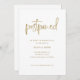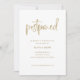 Med det här moderna bröllop ändras datumkortets trendig faux guld utseende för manuell skripttypografi som säger "senarelagd" på vit bakgrund. Ett enkelt och elegant sätt att meddela stil att bröllop har flyttats.