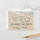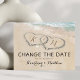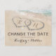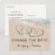 Stranddestination bröllop ändra datum vykort med en sommarlig tropisk ö bakgrund, en vintage sandstrand med två hjärtan i strandlinjen, dina initialer och en redigerbar textmall.