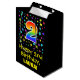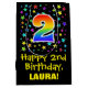 Den här färgstarka, spännande och klara presentsäcksdesignen för födelsedagspressar har ett stort nummer "2" med en regnbågsspektrumövertoning som inspirerade mönster, tillsammans med meddelandet "Lycklig 2:a födelsedagen" och ett anpassade som tar emot namn. Den har också en bakgrund i mönster med stjärnformer av olika storlek och färg. En dylik presentsäck på födelsedagen kan vara ett roligt sätt att slå ihop en gåva eller present som ges till någon som firar sin andra födelsedag. [~Z0000510]