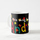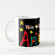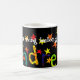 En klassikervitmugg för någon kallade Andrew med en handpainted papper collage av namn, Andrew som strilas med röda och gula stjärnor, på en svart bakgrund.