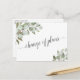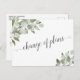 Detta enkla vykort är ett elegant och sofistikerat sätt att låta dina gäster veta om du är i den olyckliga situationen att behöva ändra eller skjuta upp dina bröllopsplaner. Framsidan läser "ändring av planer" i elegant kalligrafi med små kvistar av handmålade akvarell eukalyptusblad och grönska. Baksidan har utrymme för en anpassad anteckning där du kan förklara situationen för dina gäster.