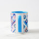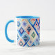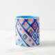 Ett vackert designat mugg som har en levande mönster av blommigtens motiv och geometriska former i blå, rosa och vit nyans. Blåhandtaget ger en slående kontrast och skapar den en perfekt som blandar konst och funktioner för ditt dagliga kaffe eller te.