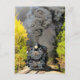 Lokomotiv nr 19färgbild av en intilliggande ångmotor i tåg på tåg-spåren som fakturerar grått och blårök från dess stapel, spåret flankas av träd på vardera sidan