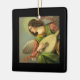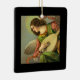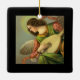 vacker renässansstil vintage målning av en ängel med brunt lockigt hår, vingar, gloria, skimrande rosa band, iförd en älsklig rosa skjorta, vacker grön klänning med guldkrage, och vackra graciösa händer med fingrar som strummar en mandolin placerad i hennes knä, och hon verkar stå ovanför och titta ut under sig. detaljerad, delikat och lugn bild i mjuka gröna och rosa nyanser.
