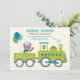 Skicka gästerna en biljett att åka med med denna lekfulla ånglokståg födelseinbjudan på en teal prickig bakgrund. En bedårande teddybjörn-konduktör vinkar från ett ljust ånglok som drar en festlig järnvägsvagn med stjärnor och ballonger. Fet "Choo! Choo!"-text anger tonen ovanför anpassningsbara festdetaljer i glad blandad typsnitt. Varje textrad kan anpassas för att matcha din lilla ingenjörs speciella dag.