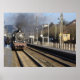 En ångmotor i vintage tåg närmar sig en järnvägsplattform.
