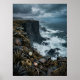 En dramatisk kustklippa reser sig över ett mörkt, virvlande hav, där vågor kraschar mot svart sten och dimma fyller luften. Inbäddade i den robusta terrängen finns rester av steampunkmaskineri – väderbitna mässingshjul, metallfragment och industriella reliker formade av tiden. Scenen blandar naturlig kraft med mekanisk elegans och skapar en slående kontrast mellan havets energi och invecklad design. Kalla blågrå toner och mjukt atmosfäriskt dis förstärker den cinematiska stämningen. Detta konstverk är perfekt för interiörer som söker en djärv fusion av gotisk kustskönhet och industriell fantasi.