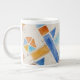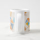 Caneca com arte em aquarela com formas geométricas nas cores base, laranja e azul, pintadas de maneira intuitiva e coordenada pra deixar espaços harmônicos entre os formatos, tornando a obra única e agradável aos olhos.