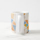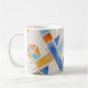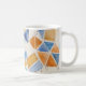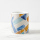 Caneca com estampa em aquarela com formas geométricas nas cores base, laranja e azul, pintadas de maneira intuitiva e coordenada pra deixar espaços harmônicos entre os formatos, tornando a obra única e agradável aos olhos