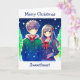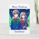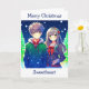 Julkort med ett sött animerat par med snöig bakgrund i gräs träd.