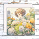 Tomt kort. Vita och gult vattenfärgblommor med en söt animerad flicka sitta inuti. Ai art.