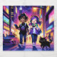 Färgfull animerad spelare sitta med sitt kattspel för nästa redo. Etiketter för flytande Flaska.