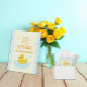En lycklig anka! Första födelsedag med gummi anka och bubblor mot ljusblå gingham och gult av blek med orange text