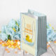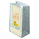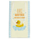 En lycklig anka! Första födelsedag med gummi anka och bubblor mot ljusblå gingham och gult av blek med orange text
